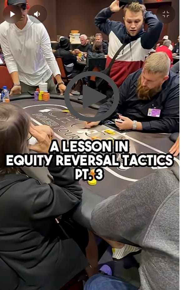 During their match, Cruz ran a massive semi-bluff with just bottom pair and a flush draw on an ace-eight-eight-four turn that could have cost him the tournament, but instead, he got the bluff through, then gleefully tabled his hand to stick the needle into his opponent.
